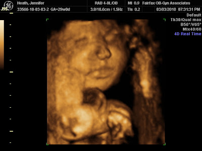Although I thought the day would never come, it did-- Justin and I (and Baby Jackson) had our 4D sonogram with "Bella Baby" tonight! And, after a dinner that didn't settle well with either of us, it was the highlight of our night (and week). We were so blessed with a sonographer who took her time with us (we paid for 15mins, but got 23mins) in order to produce some awesome images. At first, baby Jax wouldn't cooperate and look at the camera. He was incredibly mobile during the session (kicking, jabbing, rolling) and would hardly be still enough to get photographs. Also (and this is so very endearing), he continuously played with and snuggled with his umbilical cord (the sonographer had never seen it to this extent before). At times, because he was making "sucking" motions, it took like he was teething on his cord. So cute! Several times our sonographer also commented on how very laid back he was. She had me turn to my side twice, she jiggled my belly extensively, she had Justin talk to my belly, and she mashed a lot on my abdomen-- through all of it, Jackson happily played with his cord and didn't turn. Additionally, I learned that he was "seated very low in my pelvis." I certainly hope that's a good thing! EeeK!
